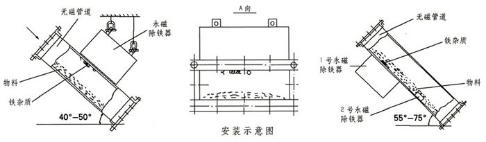 RCYA管道永磁除鐵器包括無磁管道和永磁鐵兩部分,專用于對(duì)封閉管道內(nèi)非磁性物料的除鐵,永磁除鐵器內(nèi)部采用高性能稀土強(qiáng)磁材料組成復(fù)合磁系。具有體積小、磁力大、重量輕、除鐵干凈、方便、無能耗、使用壽命長等特點(diǎn)。適合沒有輸送皮帶,只能提供下料溜槽的場合。當(dāng)散狀物料經(jīng)過管道式永磁除鐵器時(shí),鐵雜物被高場強(qiáng)的永磁鐵所吸附,清除鐵雜質(zhì)時(shí),打開管道專用門將雜質(zhì)取除。該設(shè)備適用于含鐵量較少的場合,含鐵較多的場合應(yīng)選用自卸式除鐵器。主要應(yīng)用于水泥、化工、煤炭、塑料、耐火材料、建材、造紙等行業(yè)的下料管道中清除鐵雜物。